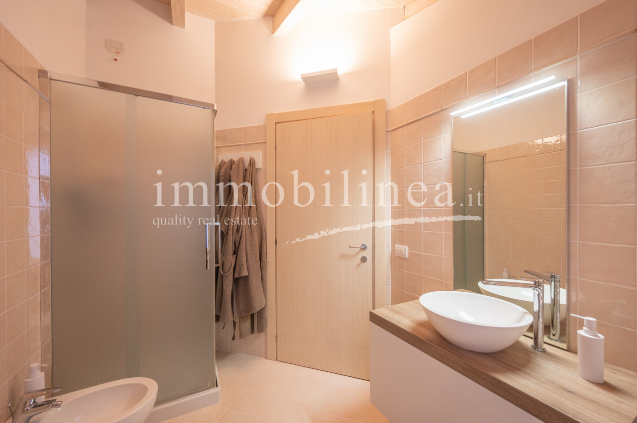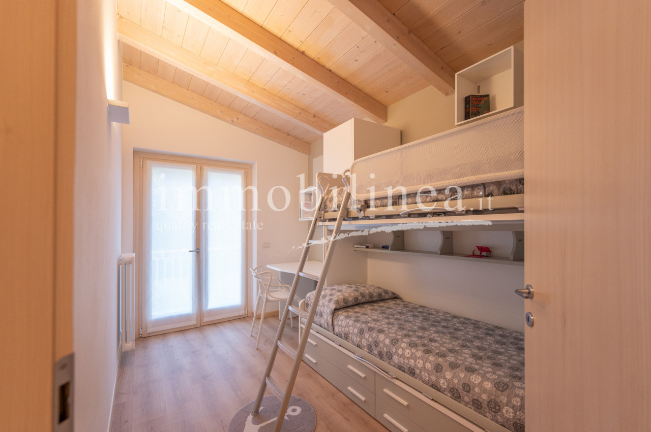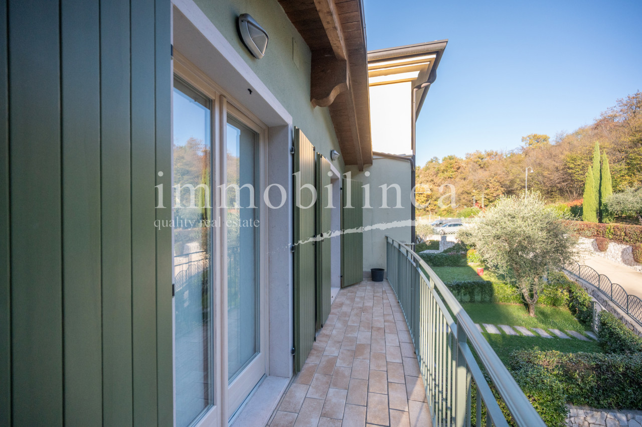 L'appartement dispose de grands espaces lumineux : le salon ouvert est rehaussé par un plafond moderne avec des poutres en bois naturel apparentes, tandis que les grandes baies vitrées coulissantes se connectent directement à la terrasse habitable et au balcon avant. De là, vous profiterez chaque jour d'un panorama spectaculaire sur le lac de Garde et les montagnes environnantes ; l'espace extérieur meublé est idéal pour se détendre ou déjeuner en plein air entouré par la nature.