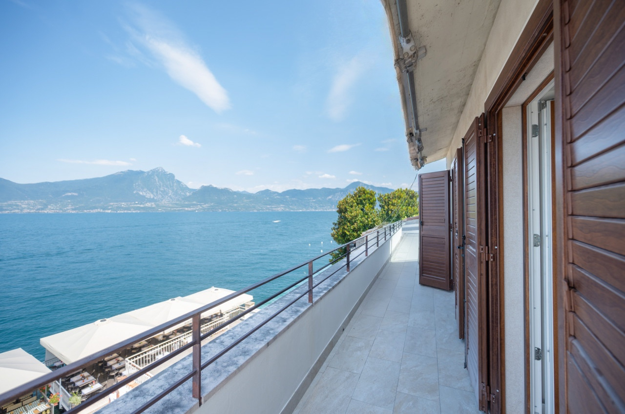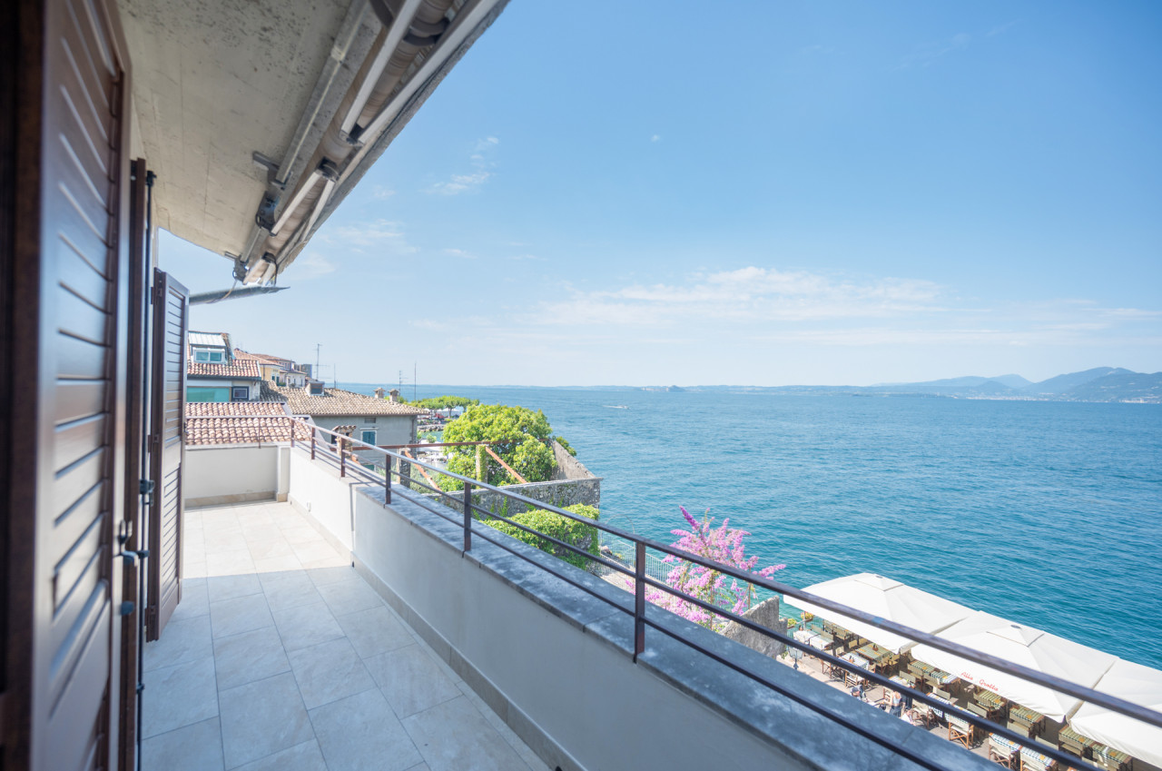 Caratterizzato dalla pavimentazione integralmente in legno si compone di: ingresso, soggiorno con cucina a vista, camera matrimoniale con cabina armadio e bagno privato finestrato, camera singola, ulteriore bagno finestrato e piccola lavanderia. La zona giorno e la camera padronale immettono sulla spettacolare terrazza privata con una meravigliosa vista a 180 gradi sul Lago di Garda. Completa la proprietà un comodo garage a due passi dal centro.