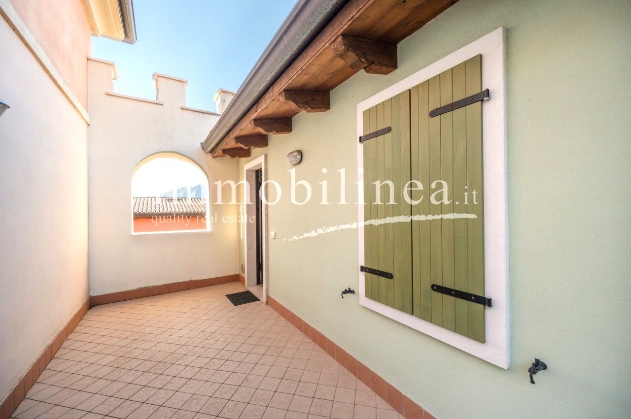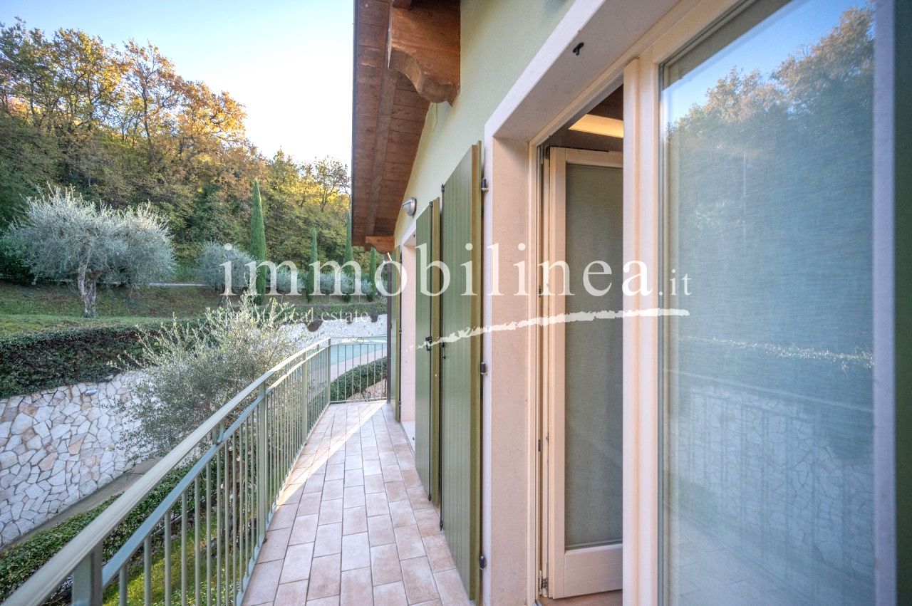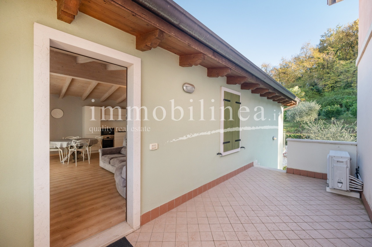L’appartamento vanta ambienti ampi e luminosi: la zona giorno open space è impreziosita dal moderno soffitto con travi a vista in legno naturale, mentre le grandi vetrate scorrevoli collegano direttamente al terrazzo abitabile e al balcone frontale. Da qui si gode ogni giorno uno spettacolare panorama sul Lago di Garda e sulle montagne circostanti; lo spazio esterno arredato è ideale per rilassarsi o pranzare all’aperto circondati dalla natura.
